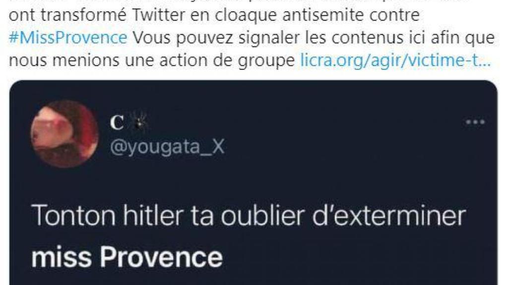 La Licra (Ligue internationale contre le racisme et l’antisémitisme) a quant à elle appelé à signaler sur son site les messages antisémites « afin de mener une action de groupe ». « Rendez-vous devant la justice pour les twittos qui hier soir ont transformé Twitter en cloaque antisémite contre #MissProvence », a averti l’association.