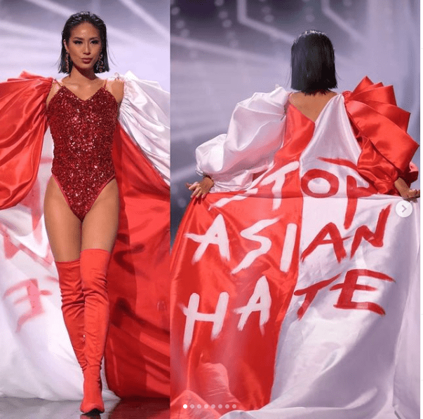 Miss Singapour, Bernadette Belle Ong, a également profité du concours du plus beau costume traditionnel pour dénoncer les discriminations contre les Asiatiques. Vêtue d’un body rouge scintillant et de cuissardes assorties, elle s’était retournée, révélant les mots « Stop à la haine contre les Asiatiques » sur sa cape aux couleurs du drapeau singapourien.