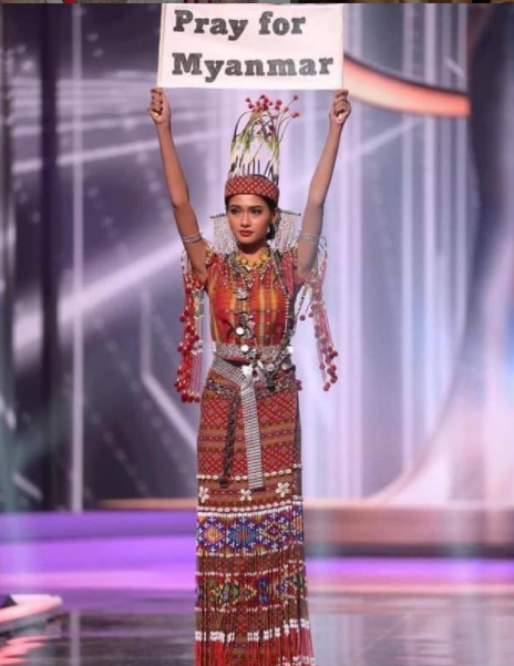 Elle a remporté ce jeudi le prix du plus beau costume traditionnel : vêtue d’une tenue perlée, ornée de motifs traditionnels birmans, elle avait brandi une pancarte « Priez pour la Birmanie », en anglais. Au moins 796 personnes ont été tuées par les forces de l’ordre en Birmanie depuis le coup d’Etat du 1er février, selon une ONG, et plus de 3.800 personnes sont détenues.