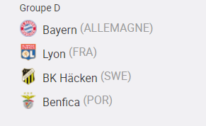 Les compositions des groupes qui ont résultés de ce tirage nous assure, d’ors et déjà, de grands moments d’émotion footbalistique, avec des affiches comme un Fc Barcelone – Arsenal ladies, dans le groupe C, un Paris Saint-Germain – Real Madrid dans le groupe B, un Olympique lyonnais – Bayern Munich dans le groupe D, et un groupe A « de la mort », dans lequel s’affronteront Chelsea ladies, Wolfsburg (2 fois vainqueur de la compétition), Juventus de Turin, le Servette de Genève étant le quatrième et plus faible de ces quatre clubs.