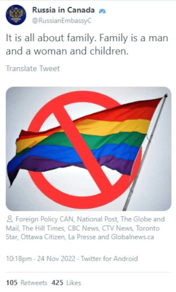 Les tweets russes comprenaient une photo d’un drapeau arc-en-ciel barré d’une ligne rouge et accompagnée de commentaires. « Tout est question de famille. La famille, c’est un homme, une femme et des enfants. »