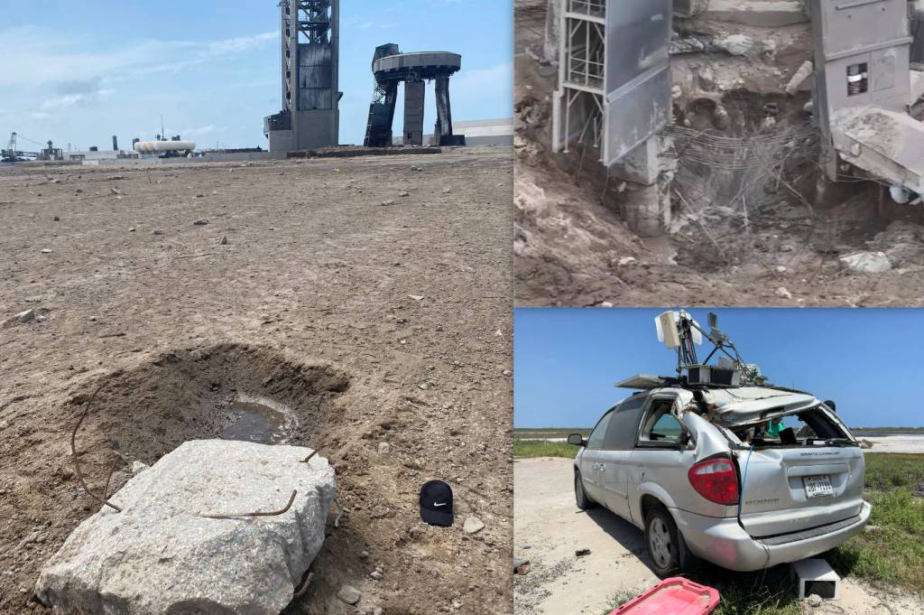 Déjà, dès le 22 avril (soit moi de 48 heures après le décollage et l’explosion de Starship), les dizaines de journalistes et/ou photographes qui étaient allés récupérer leurs caméras et appareils photos sur la star base de Space X (caméras et appareils photos étant toujours déposés sur des trépieds, à quelques centaines de mètres des pas de tirs de fusées afin de pouvoir réaliser les captures vidéos et photographiques – les humains risquant de graves dommages physiques à la poussée des réacteurs) avaient découvert que tous les appareils étaient totalement détruits, trouvant même leurs cartes mémoires, éjectées de leurs appareils, à des centaines de mètres et cassées en de nombreux morceaux. Tous avaient alors pris des photos des dégâts causés par la poussée des trente-trois réacteurs de la fusée, les publiant sur leurs comptes de réseaux sociaux.