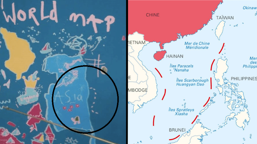 Sur cette carte, l’Asie est représentée par un bloc bleu avec des pointillés blancs. Ce détail, en apparence anodin, est perçu comme une provocation par plusieurs pays d’Asie du Sud-Est. En effet, ces lignes esquissées sur la mer de Chine méridionale ne reflètent pas la réalité géographique, mais plutôt les revendications territoriales de Pékin. Pour les Philippines et d’autres nations de la région, ces pointillés ne sont pas innocents et « ils reprennent le récit chinois et ses désirs expansionnistes ».