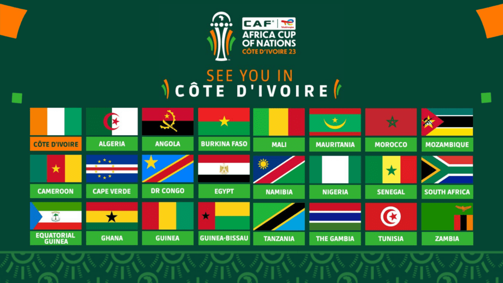Les 24 équipes qualifiées sont : la Côte d’ivoire, le Burkina Faso, la Guinée, le Sénégal, l’Algérie, la Tunisie, la Guinée équatoriale, l’Afrique du Sud, le Maroc, le Nigeria, la Zambie, la Guinée Bissau, le Cap Vert, le Mali, la Guinée, la RD Congo, le Mozambique, la Tanzanie, la Mauritanie, le Ghana, l’Angola, le Cameroun, la Namibie.
