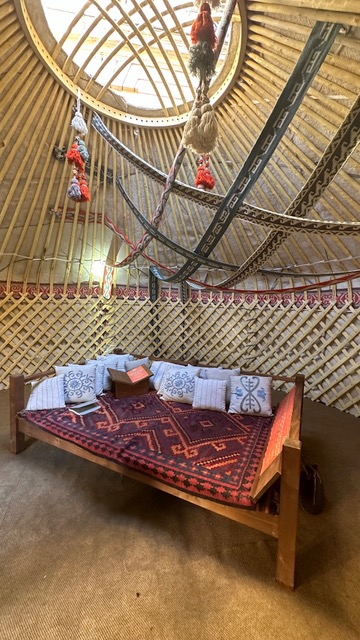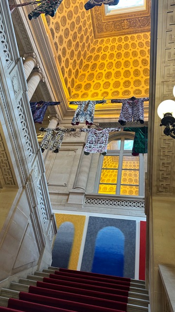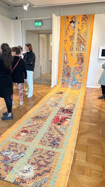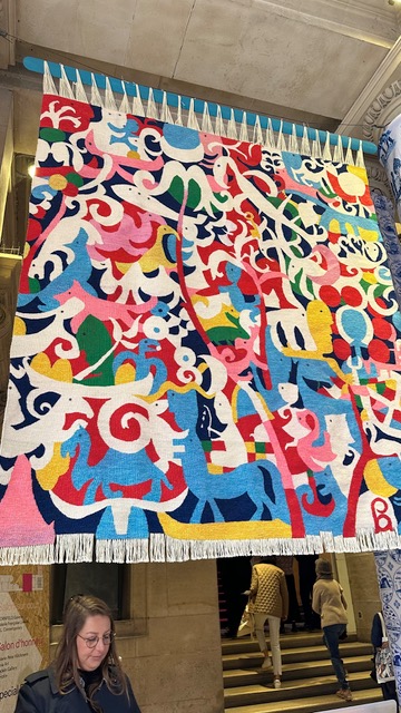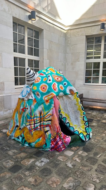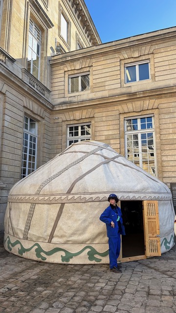 Ainsi, dans l’entrée de la Monnaie de Paris, les grandes colonnes en marbre et les murs ont été recouverts de tapisseries et de tissus en tout genre. En haut des escaliers d’honneur, des dizaines de kimonos traditionnels en ikat imaginés par la créatrice Nazzy Beglari flottent dans le vide, les murs sont décorés par le triptyque de Gulnar Mukhazhanova. Deux acceuils ont choisis d’être couverts par les travaux du célèbre artiste Kazakh Alibay Bapanov, pratiquant l’art textile avec le technique ancestrale kazakh du feutre en le réinterprétant avec créativité. Dans la cour centrale une large yourte (maison nomade) invite les visiteurs à s’allonger, pendant qu’une plus petite yourte colorée, conçue par l’artiste Kokonja, attend ses petits visiteurs dans une autre cour, recouverte de morceaux de textiles turquoise, rose ou jaune, cousus selon les savoir-faire anciens.