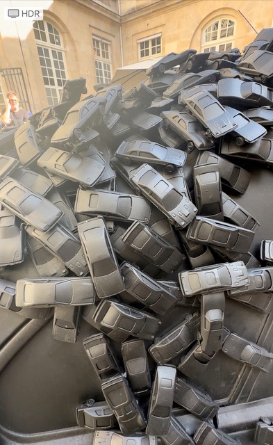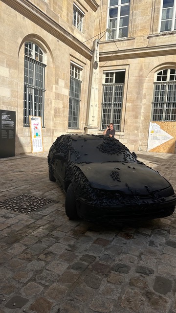 sous la forme d’une grande voiture noire dont la carrosserie est endommagée. La voiture semble être la source et le lieu de la vie.