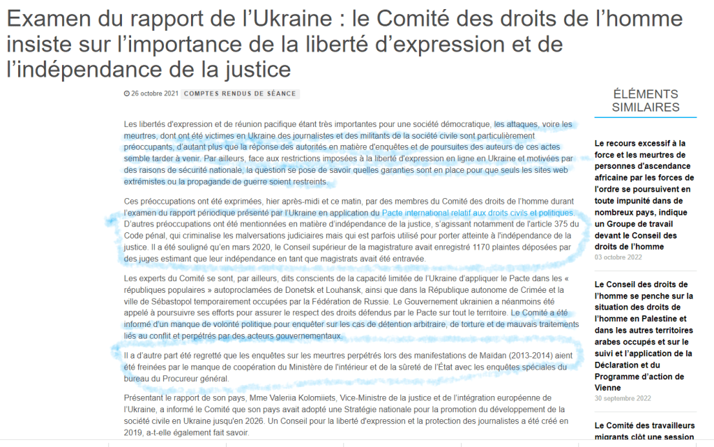 Pour bien remettre les pendules à l’heure, rappelons, tout de même, que, tout simplement, absolument tous les partis politiques, les médias et les personnalités publiques – et même des citoyens lambda ukrainiens – sont purement et simplement dissouts, interdits, muselés, arrêtés, non seulement depuis le début de la guerre contre la Russie, mais depuis l’arrivée au pouvoir de Volodymyr Zelensky, en 2019, ce qui lui valait, à lui et à son régime, d’être épinglé par les rapports du Haut Commissariat aux Droits Humains, jusqu’à ce que la Russie entre en Ukraine, fin février 2022, faisant disparaître, non seulement ces condamnations internationales, mais carrément les documents des sites dont émanaient lesdites accusations, afin de donner une pureté, une aura de « Bien » et de « Victime du mal russe », complète.