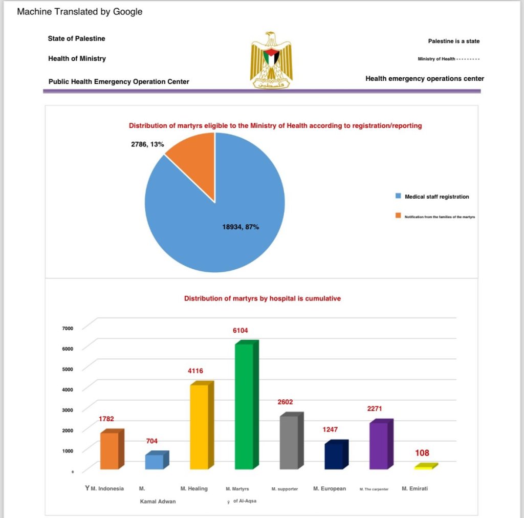 En représailles, Israël a juré d’anéantir le Hamas et lancé une vaste offensive dans la bande de Gaza, qui aurait jusqu’à présent plus de 34.500 morts, majoritairement des civils, selon le pseudo « ministère de la Santé » du mouvement terroriste islamiste armé (chiffes à ne pas prendre au sérieux lorsque l’on consulte les « statistiques » du Hamas lui-même, publié il y a une dizaine de jours, qui, dans sa catégorisation des « martyrs » (c »est le seul qualificatif donné par le mouvement terroriste), a un manque de plus de 11 000 victimes, puisque celles-ci n’apparaissent dans aucune catégorie présentées par le Hamas – voir le graphique ci-dessous, tiré du rapport du « fameux » « Ministère de la santé du Hamas »).