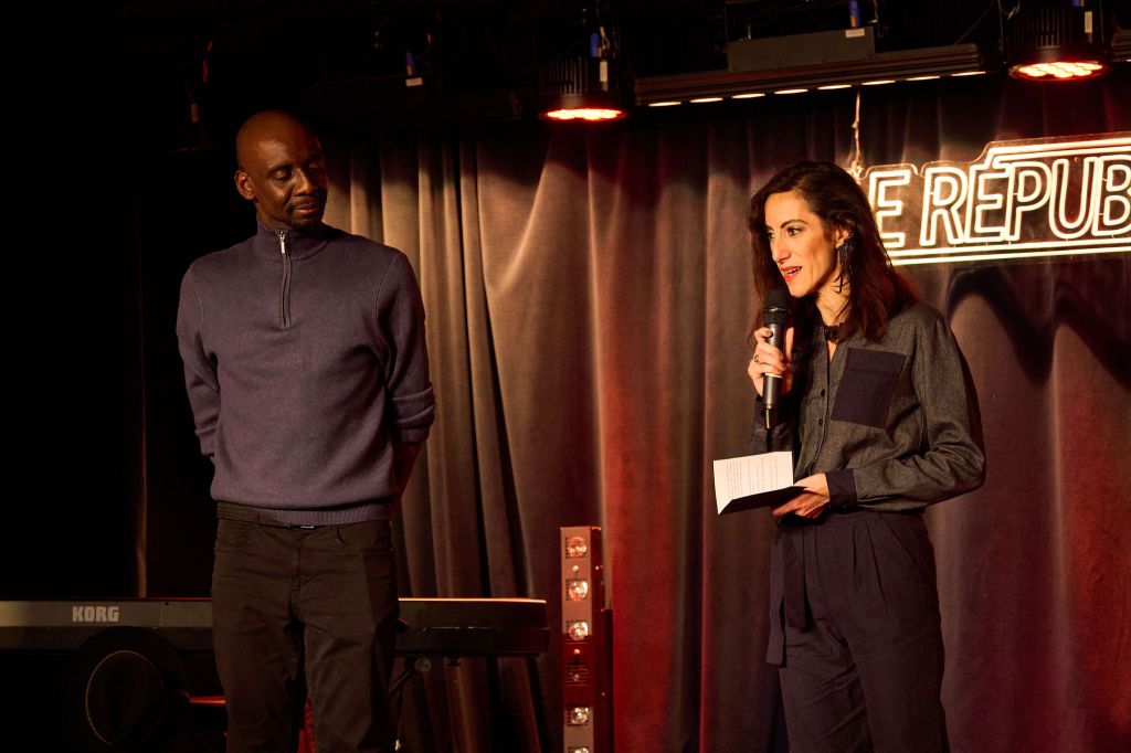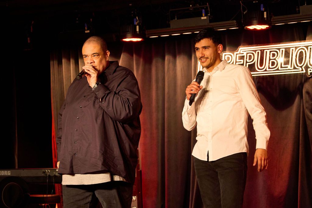 Pris la suite, NI2S et son numéro de « beatbox » intitulé « You remember that » – « Tu te souviens de cela », en français), sorte de compilation de morceau musicaux très célèbres interprétés exclusivement avec sa bouche (ce que l’on appelle, justement, le « beatbox »). De quoi animer et bien faire bouger le public dans cette salle du « République ». Salle qui s’anima encore plus lors du second passage de NI2S puisque, cette fois, il fut accompagné de Constantin qui avait troqué son piano pour son violon (comme nous l’avions indiqué dans notre paragraphe sur son duo avec Jade), mais toujours avec la même virtuosité et, qui plus est, de l’humour, dans un savoureux mélange de morceaux modernes interprétés par NI2S, toujours en « beatbox » et de musique klezmer (tradition musicale instrumentale des Juifs ashkénazes – Europe Centrale & de l’Est – qui, lorsqu’elle est chantée, l’est en yiddish, langue des juifs d’Europe proche de l’Allemand) particulièrement festive et entraînante.