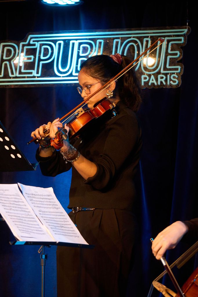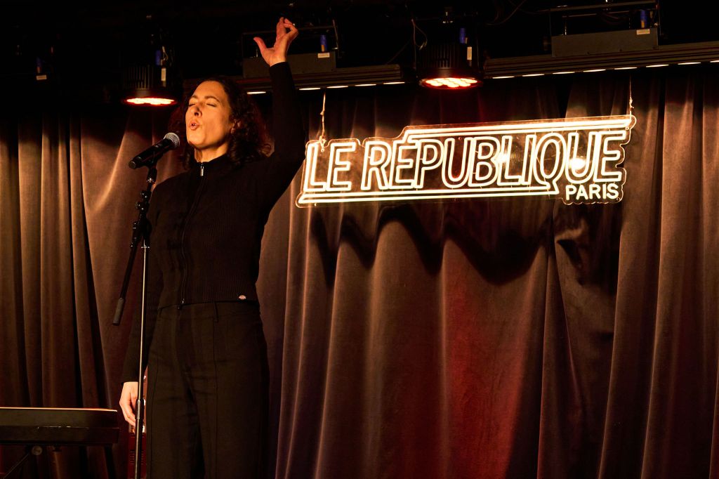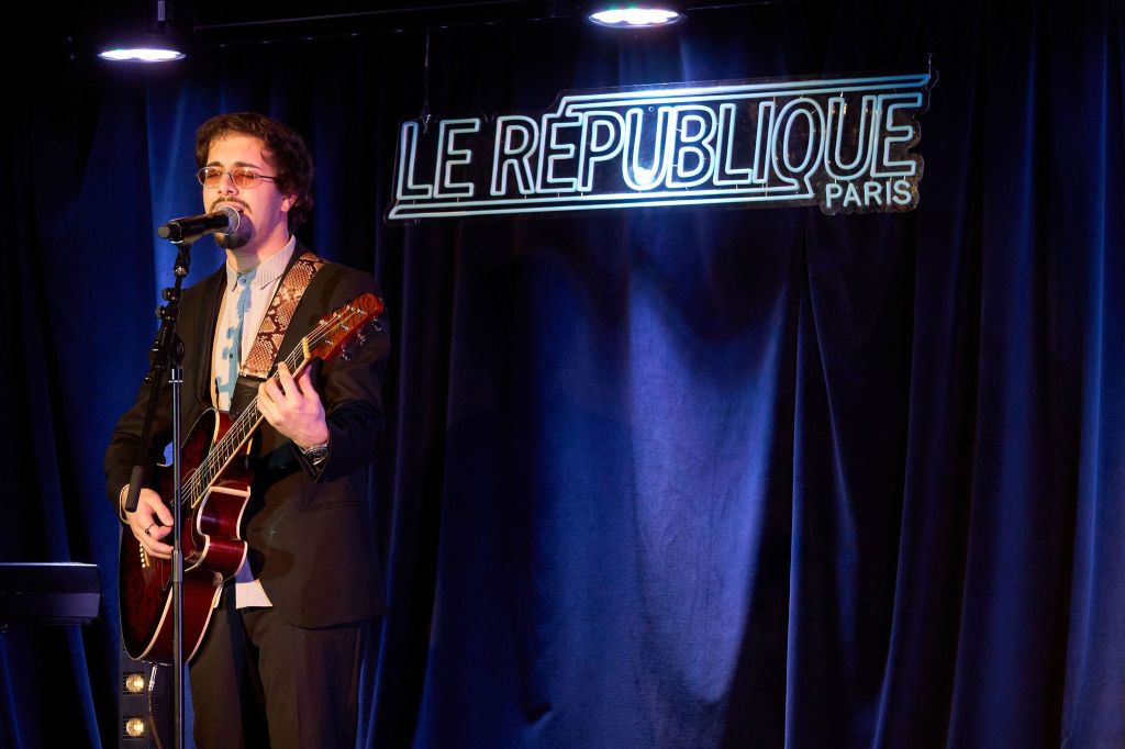 Suivant l’ouverture d’Eva, c’est un duo composé de Constantin au piano et de Jade à l’interprétation, qui se présente sur la scène du « République ». Il ne faut que quelques instants pour constater la virtuosité du pianiste (que nous reverrons, lui aussi, plus tard, muni d’un violon, non seulement lors de sa deuxième prestation avec Jade, mais également dans un duo « multi-instrumental »). Jade, elle, dans cette prestation de type un peu Jazz et beaucoup cabaret, ne chante pas, étant, cette fois, « actrice-récitante ». Cela offre l’opportunité d’un genre d’art de la scène supplémentaire à la soirée mais, toute l’élégance et même la bonne dose de sensualité de la jeune femme ne contrebalanceront pas, ici, hélas, le choix de l’anglais plutôt que du français, réduisant assez grandement l’intérêt car, bien que nous soyons à Paris, ce n’est pas pour autant que le public est capable de comprendre ce qui se dit. D’ailleurs nous avons ressenti un flottement dans l’implication du public à cause de ce choix de l’anglais, puisque, lors des quelques moments où chantait Jade, l’audience s’animait à nouveau, étant normalement conditionné, depuis presque soixante-dix ans, à consommer cette langue lorsqu’elle est chantée. Il était d’autant plus dommage que Jade ne chante pas lors de ce premier passage que, la seconde fois, elle a pu montrer qu’elle chante franchement bien et que sa voix est fort agréable à écouter, rendant, ainsi, la seconde interprétation du duo bien meilleur.