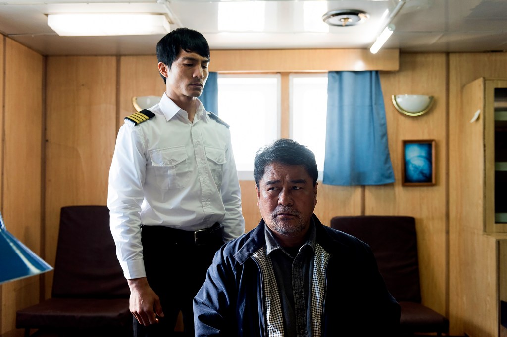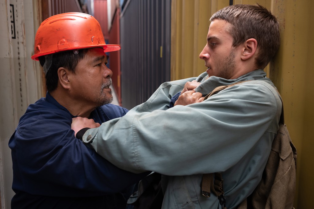 Et, du suspens, il y a en vraiment dans ce film. Tout dans sa réalisation, de son décor et la façon de faire se mouvoir les protagonistes, son cadrage et même son univers sonore (sur lequel nous reviendront) accompagnent le récit de ce fait divers qui s’est déroulé en 1996 mais qui, soit est resté inconnu du grand public, soit en est sorti de sa mémoire. Autre élément qui participe grandement à ce suspens qui va jusqu’à un certain niveau d’angoisse, est l’impossibilité, pour les personnages principaux, de communiquer véritablement entre eux. Entre un roumain de vingt-quatre ans sans grande bagage en terme d’éducation (interprété par Nicolaï Becker – acteur que nous découvrions ici et qui est très convainquant), un marin philippin à l’orée de la soixantaine (l’acteur Solimar Cruz, grand acteur philippin qui avait 59 ans l’année du tournage et qui, hélas, est quasiment inconnu dans cette France qui, bien qu’elle ai une population qui se targue d’une sorte de « supériorité culturelle » n’est pas capable de sortir en salles des films d’auteurs d’un grand nombre de pays car sachant que, bien que mille fois meilleurs que les téléfilms français qui font des millions en audience, les salles resteraient vides) et des gradés de marine taïwanais (même si, là, les acteurs, Olivier Ho Hien Hen et Alexandre Nguyen sont tous deux français, respectivement avec des origines cantonaise et vietnamienne), la seule langue commune c’est un faux anglais, encore plus basique que le mauvais anglais d’aéroports, le fameux « globish », et des rudiments d’espagnol entre les deux personnages principaux, à savoir : le jeune immigrant roumain (qui est resté quelques temps en Espagne, au moins à aider à construire une maison) et le vieux marin philippin (sans doute parce qu’il fait régulièrement escale en Espagne avec ce navire et, supposons, parce que les Philippines ont été espagnoles jusqu’à ce que les États-Unis d’Amérique ne gagnent la guerre, en 1898, qu’ils avaient volontairement provoqué, car ayant des vues sur les îles espagnoles de Cuba, Porto Rico et les Philippines). Cette impossibilité de vraiment bien se faire comprendre d’autrui – particulièrement entre le roumain et le philippin installe une tension entre les deux individus qui, en plus de la situation qui est qu’il faut cacher ce passager clandestin pour éviter qu’il ne lui arrive malheur si les taïwanais le trouvent, les deux personnages restent, malgré leur « bonne volonté » respective, totalement étrangers l’un à l’autre, ne pouvant pas, en plus, parler concrètement de la situation à bord, de ses tenants et de ses aboutissants. C’est, d’ailleurs, cette impossibilité de communiquer pleinement qui va être à l’origine du drame final.